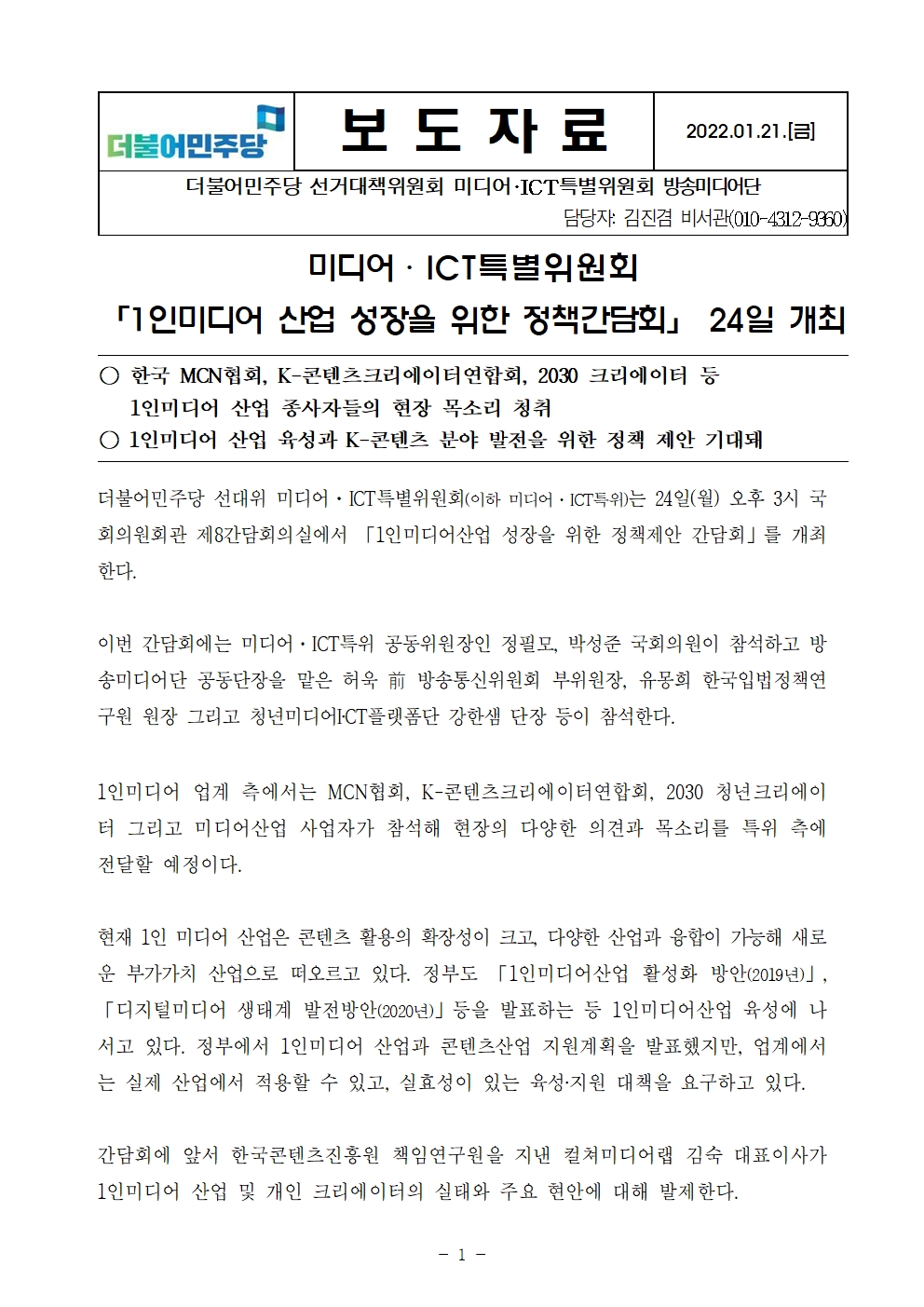 [보도자료] 더불어민주당 선대위 미디어·ICT특별위원회 '1인미디어산업 성장을 위한 정책제안 간담회' 개최