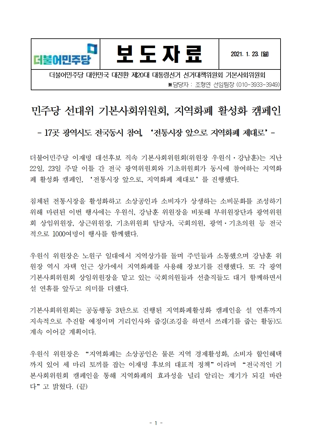 [보도자료] 더불어민주당 선대위 기본사회위원회, 지역화폐 활성화 캠페인