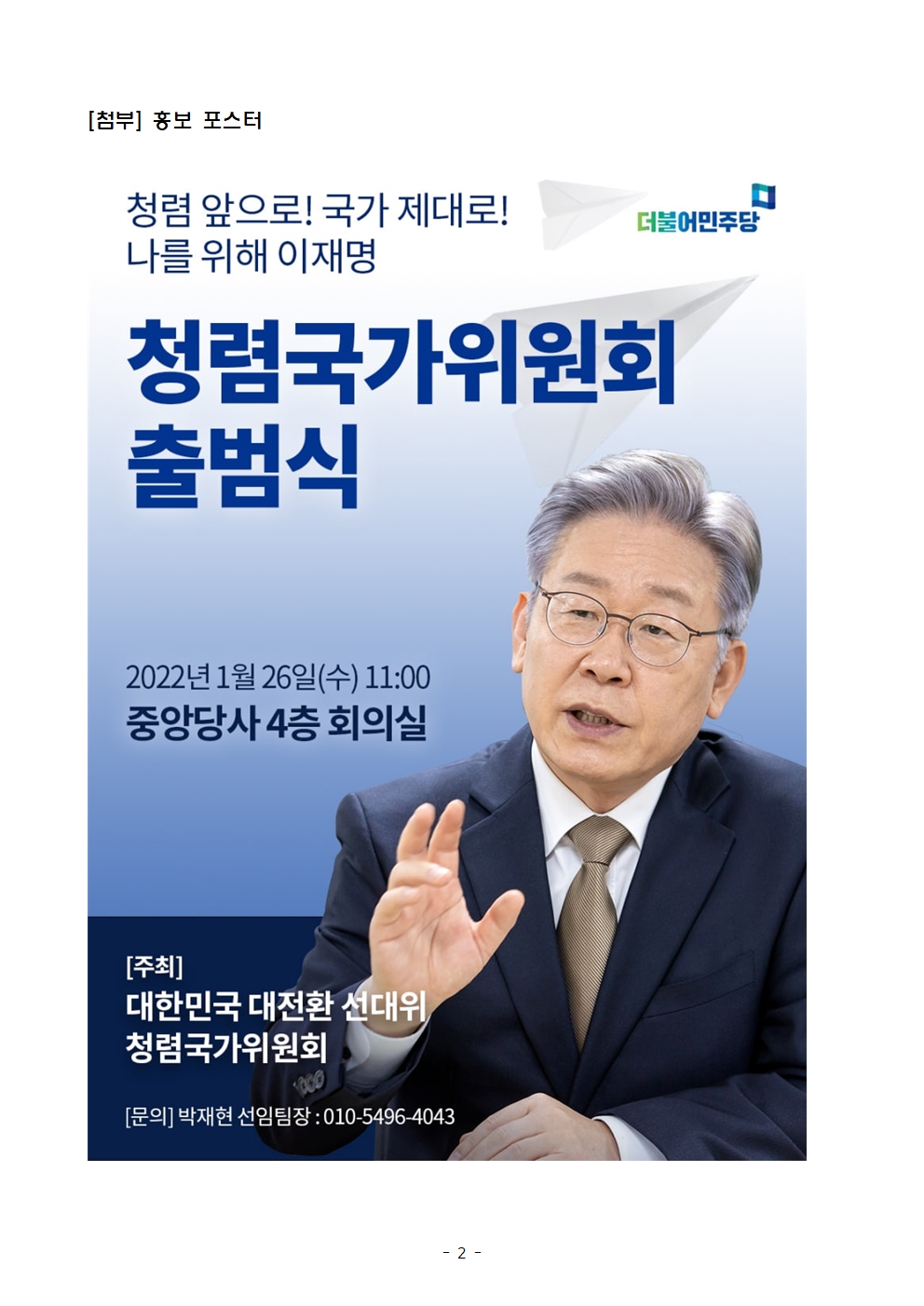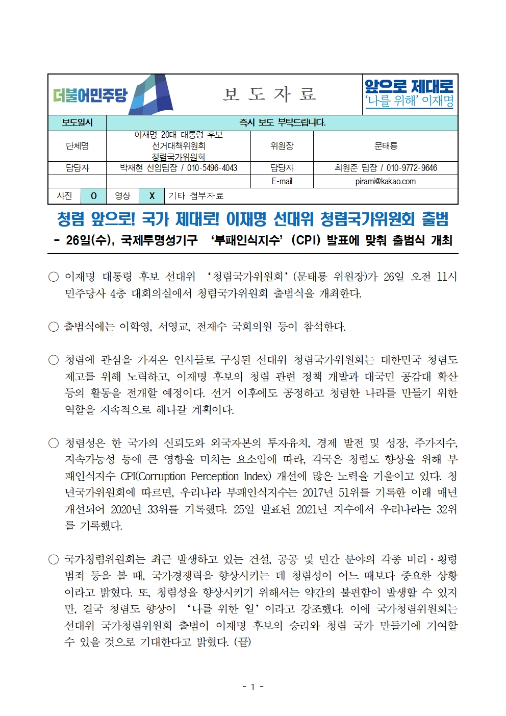 [보도자료] 더불어민주당 선대위 청렴국가위원회 출범식 개최