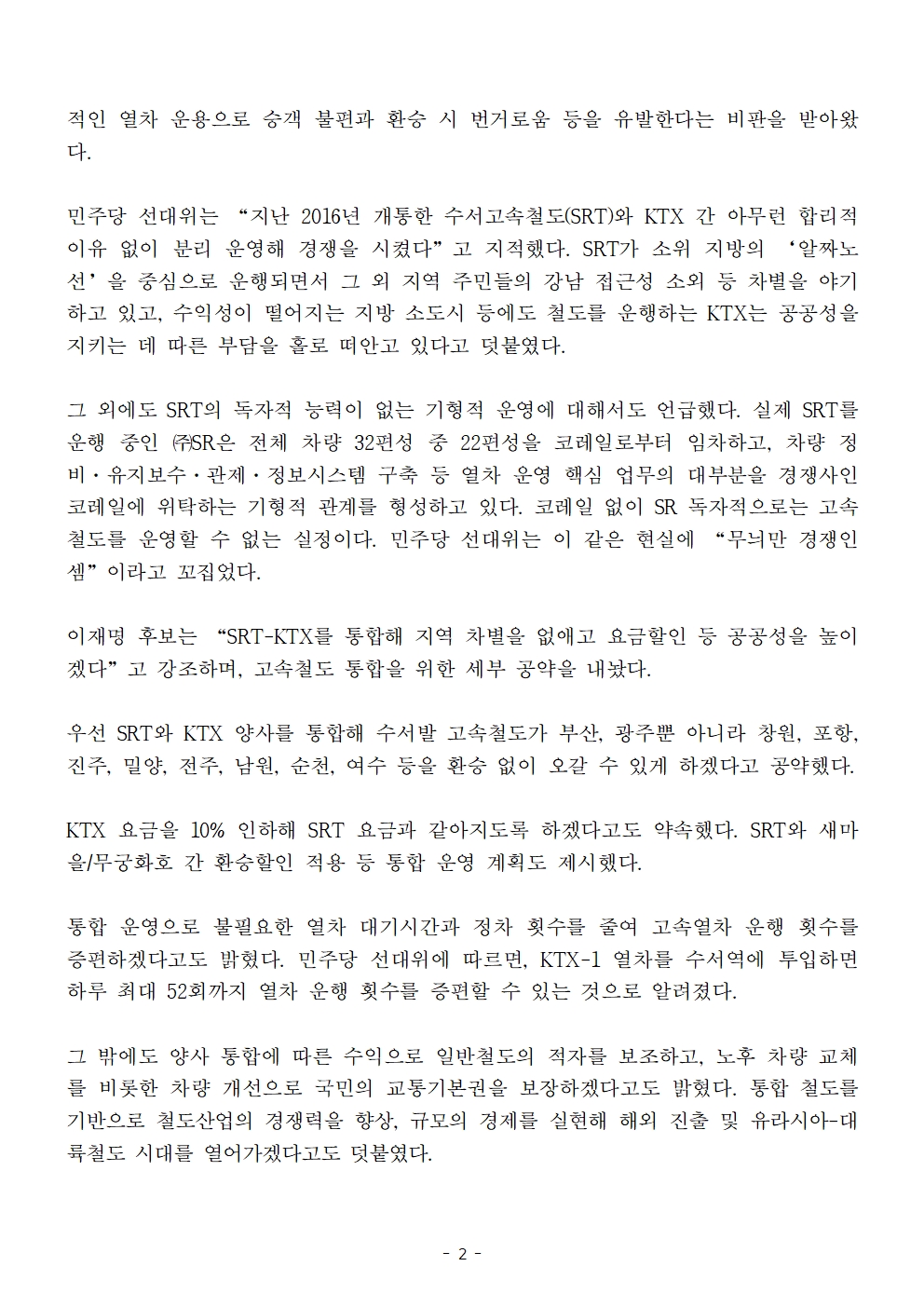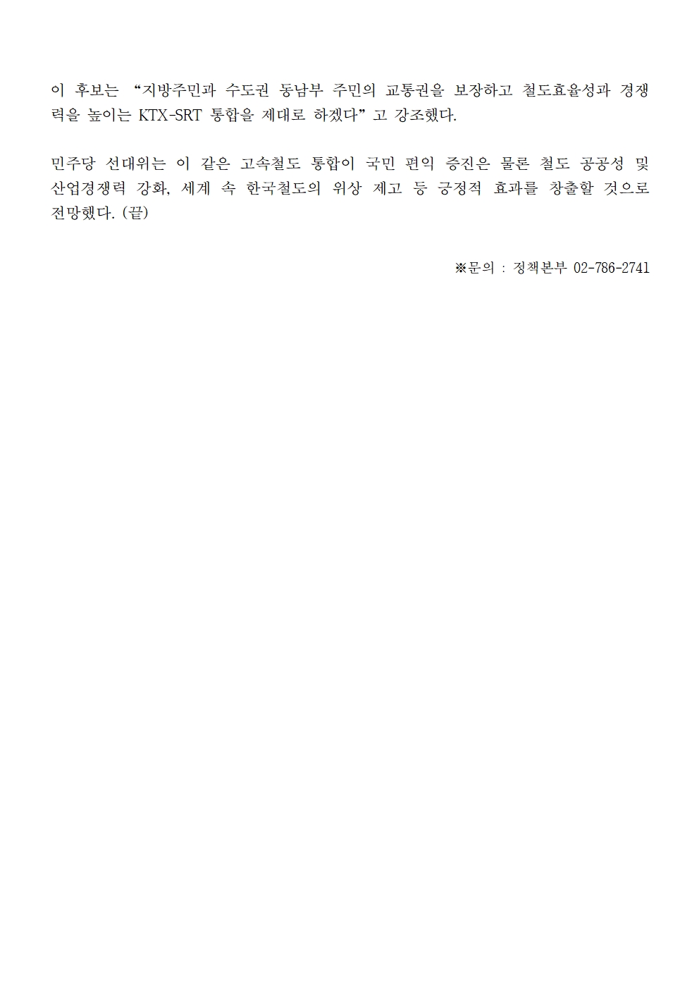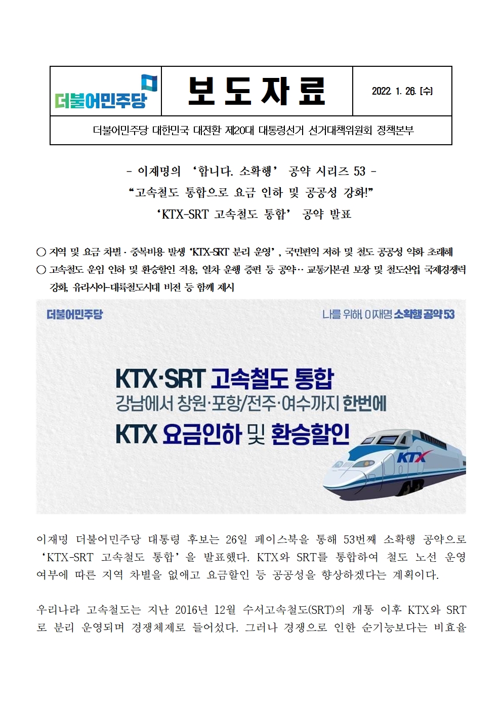 [보도자료] 더불어민주당 선대위 정책본부, '이재명은 합니다. 소확행 공약 시리즈 53' KTX-SRT 고속철도 통합 공약