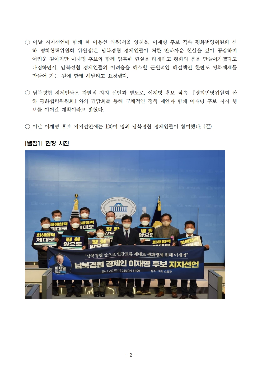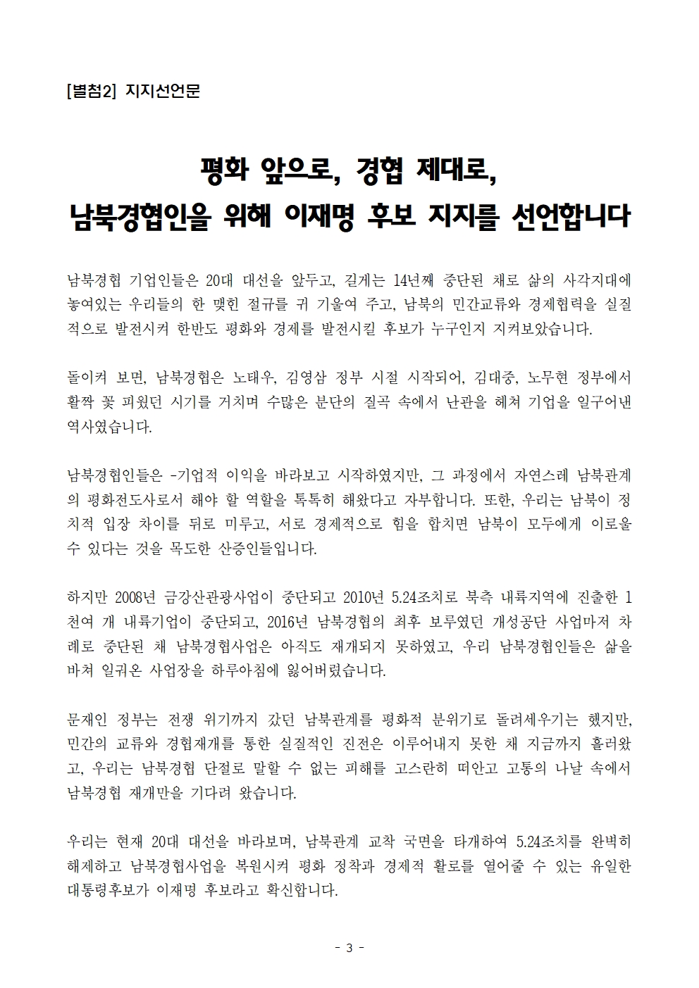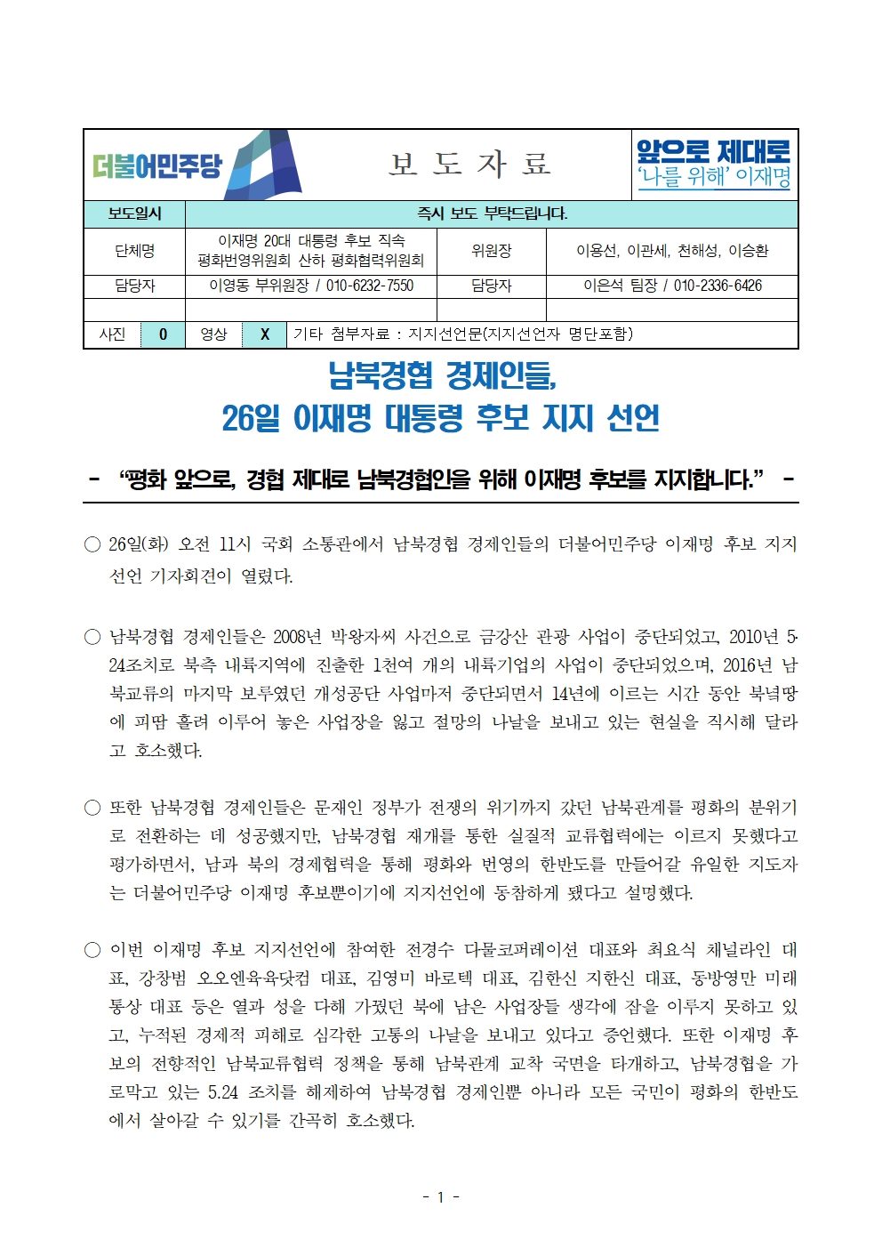 [보도자료] 더불어민주당 선대위 평화협력위원회, 남북경협 경제인들 후보 지지 선언