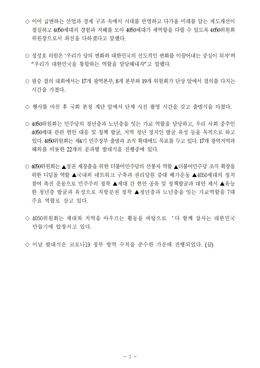 [보도자료] 더불어민주당 선대위 4050위원회 출범식 및 필승 결의대회 개최