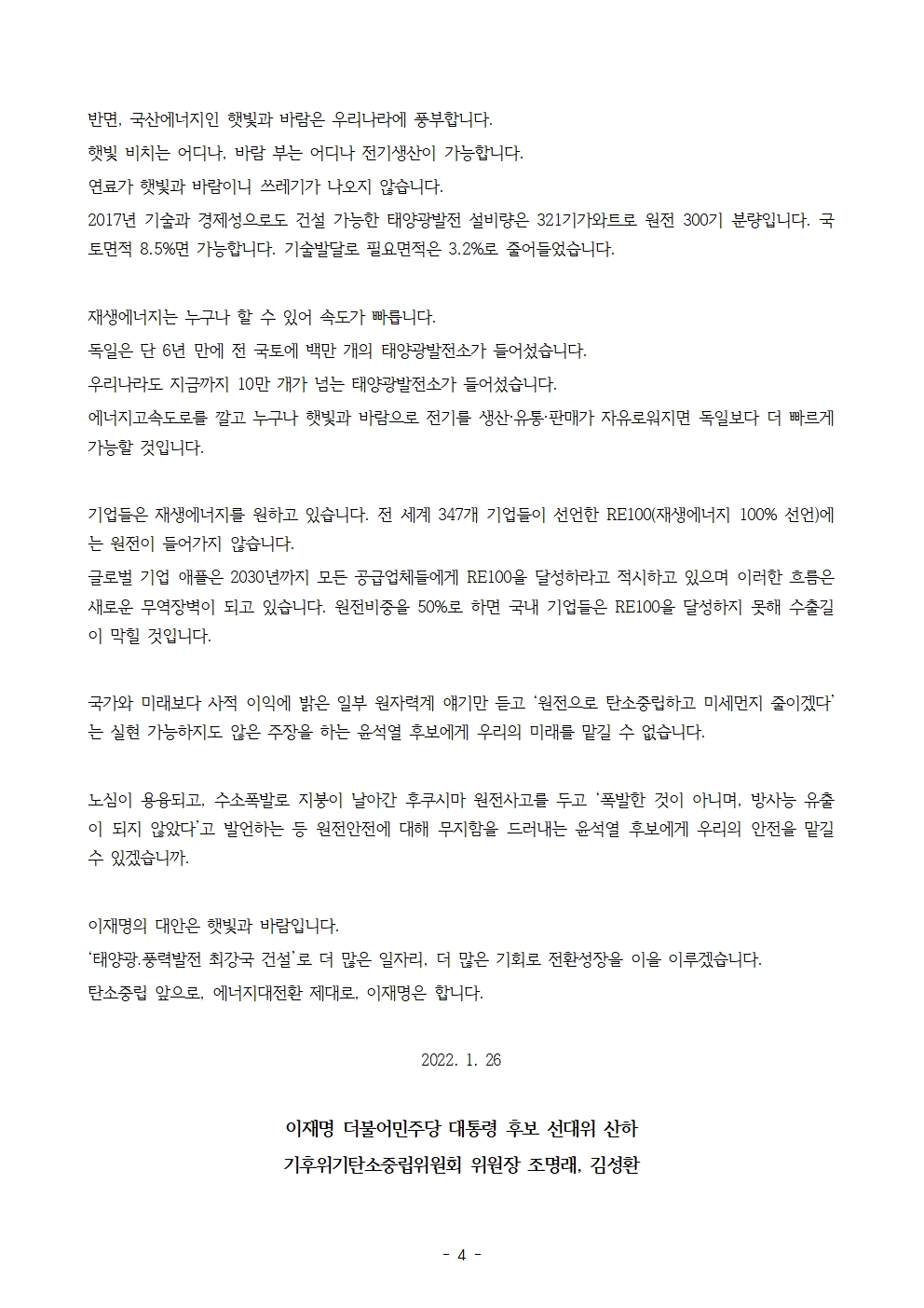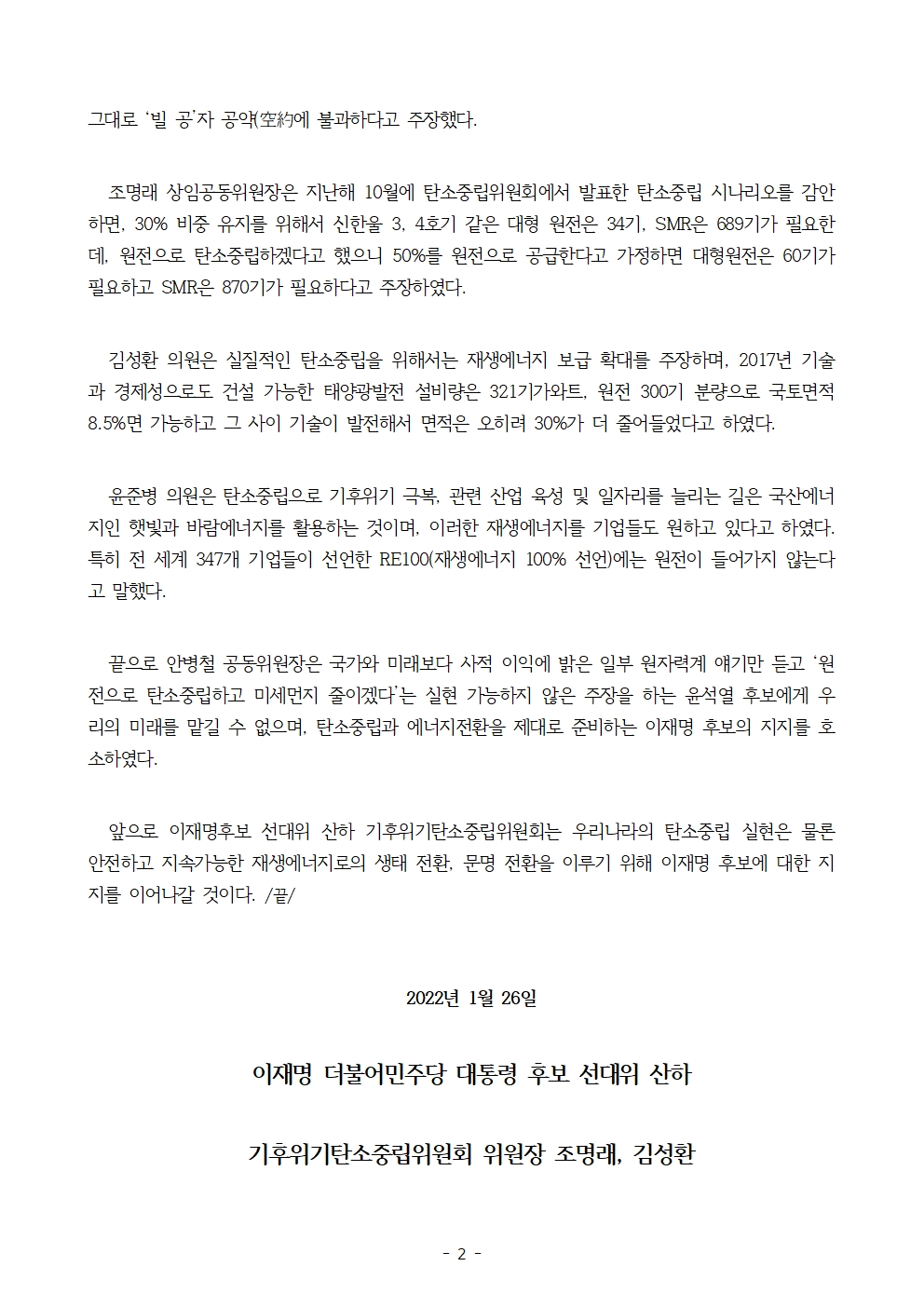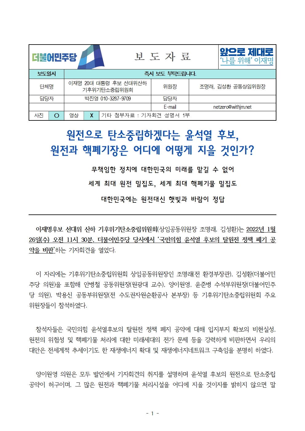 [보도자료] 더불어민주당 선대위 기후위기탄소중립위원회, 탈원전 정책 폐기 공약 비판 기자회견