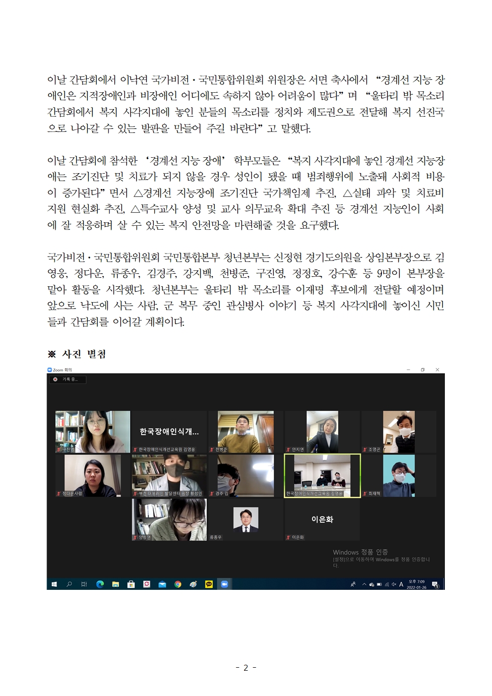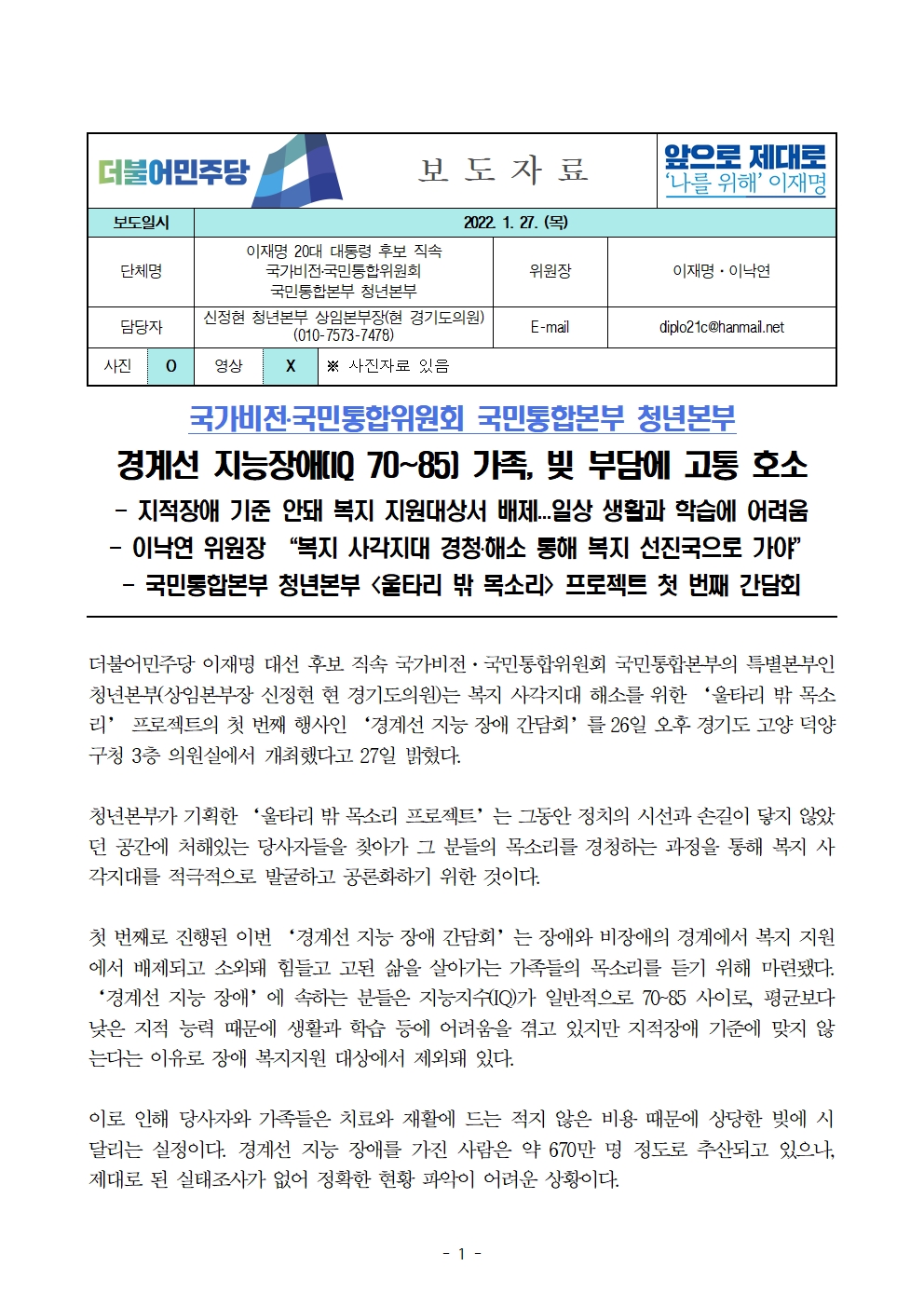 [보도자료] 더불어민주당 선대위 국가비전·국민통합위원회 국민통합본부 청년본부, '경계선 지능 장애 간담회' 개최
