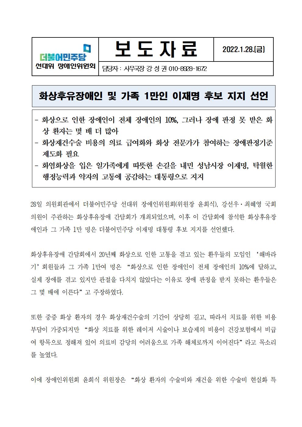 [보도자료] 더불어민주당 선대위 장애인위원회 화상후유장애인 1만인 이재명후보 지지 선언