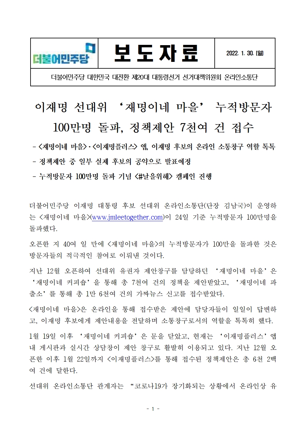 [보도자료] 더불어민주당 선대위 온라인소통단, '재명이네 마을' 누적 방문자 100만 명 돌파, 정책제안 7천여 건 접수