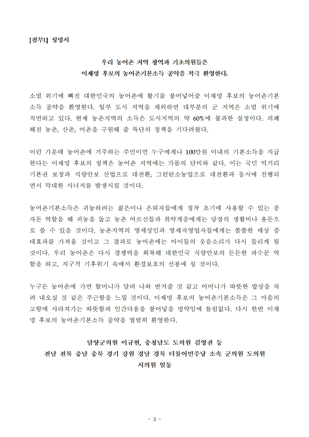 [보도자료] 더불어민주당 선대위 기본사회위원회, 전국 농어촌 광역·기초의원 1,000여 명 농어촌기본소득 공약 환영 성명