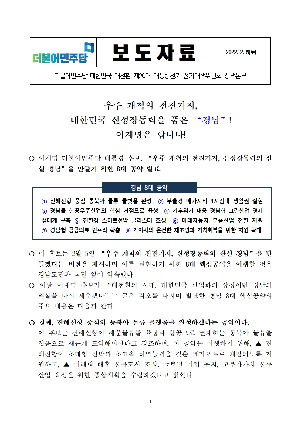 [보도자료] 더불어민주당 선대위 정책본부, 경남 8대 공약 발표