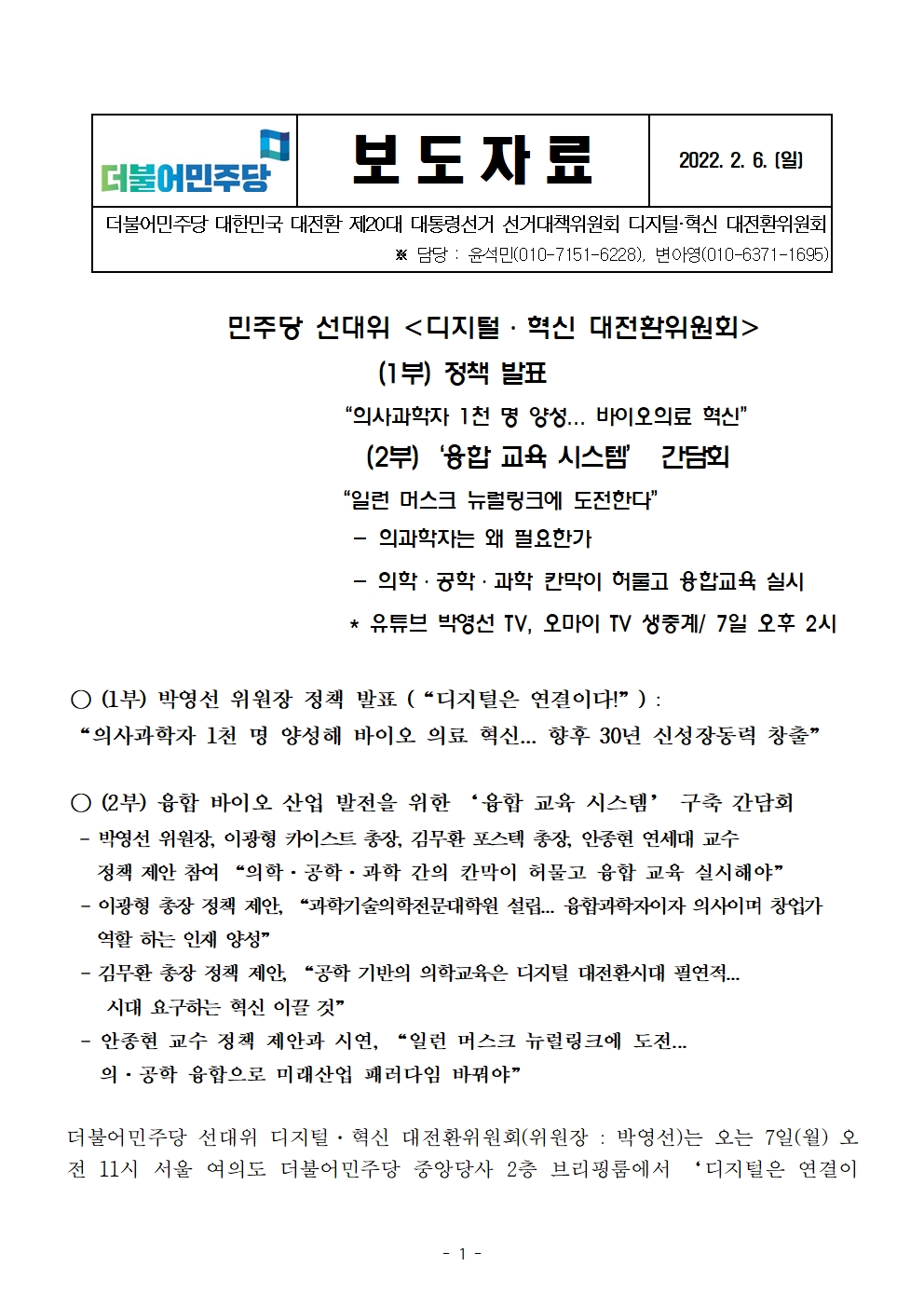 [보도자료] 더불어민주당 선대위 디지털·혁신 대전환위원회 정책발표 및 간담회 개최