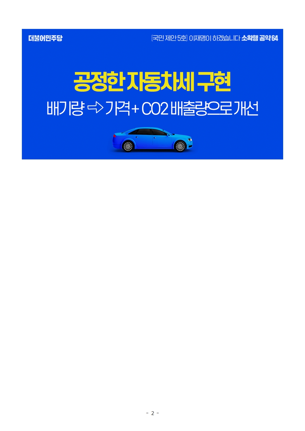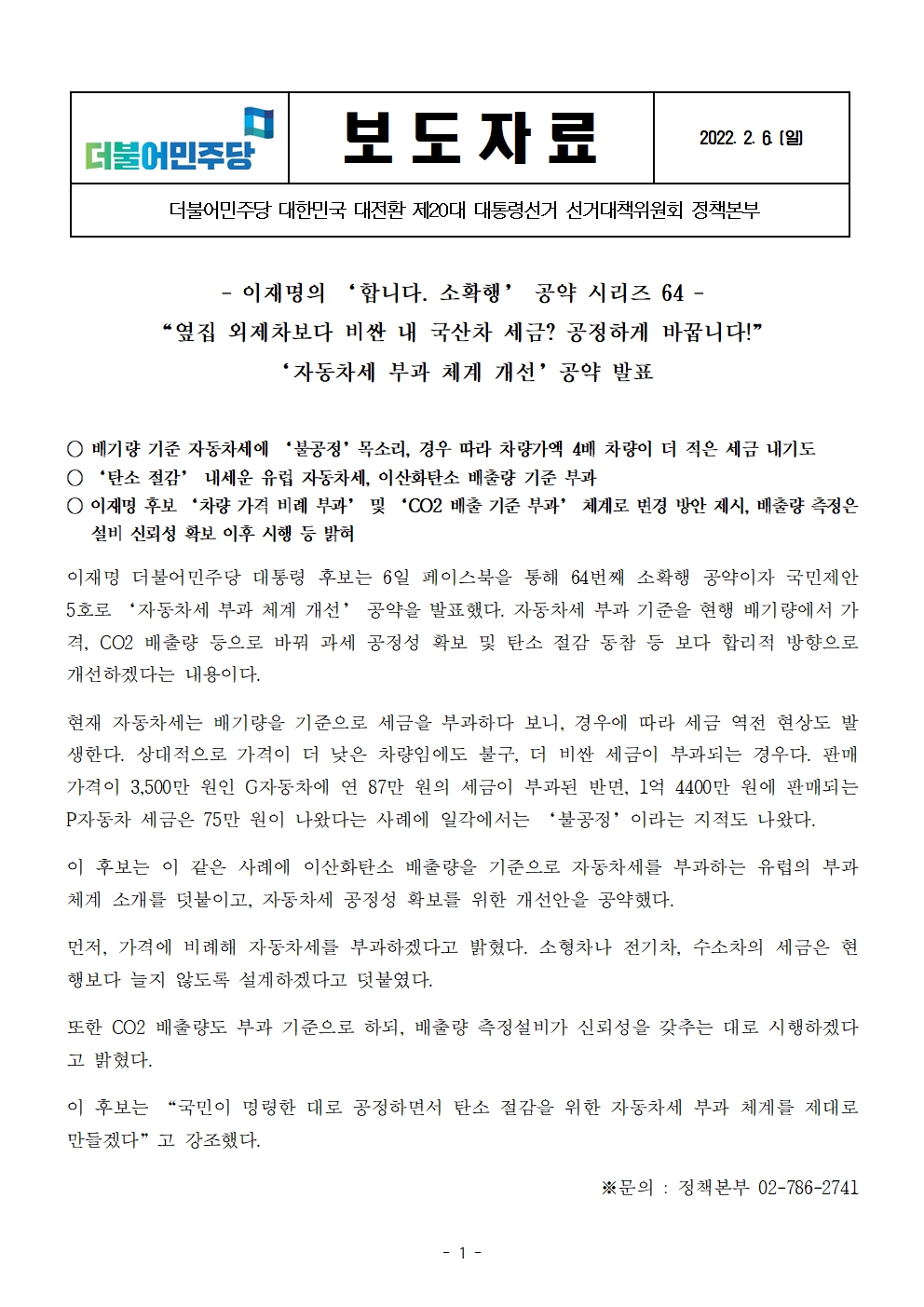 [보도자료] 더불어민주당 선대위 정책본부, '이재명은 합니다. 소확행 공약 시리즈 64' 자동차세 부과 체계 개선 공약 발표