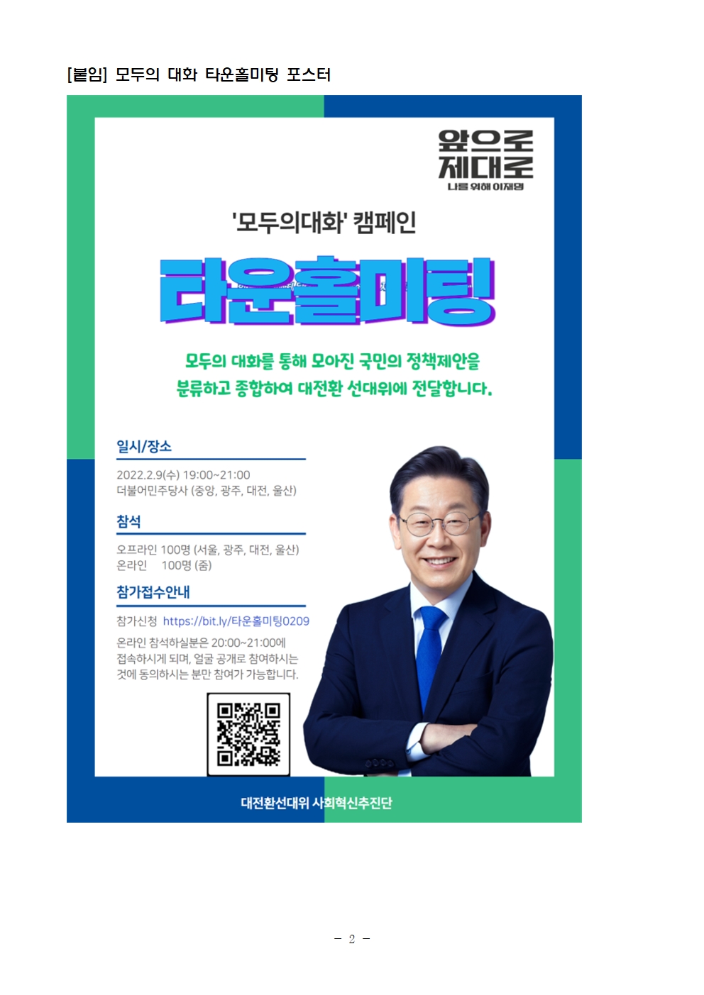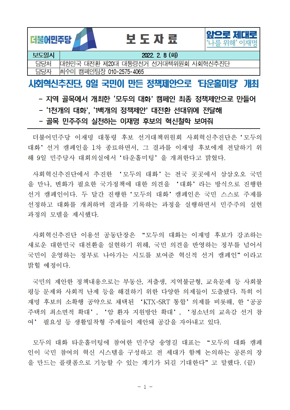 [보도자료] 더불어민주당 선대위 사회혁신추진단, 국민이 만든 정책제안으로 '타운홀미팅' 개최