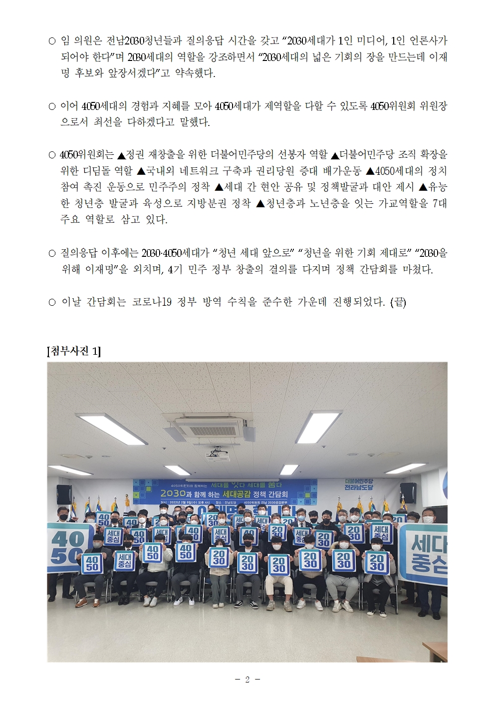 [보도자료] 더불어민주당 선대위 4050위원회, 2030세대와 정책 간담회 개최