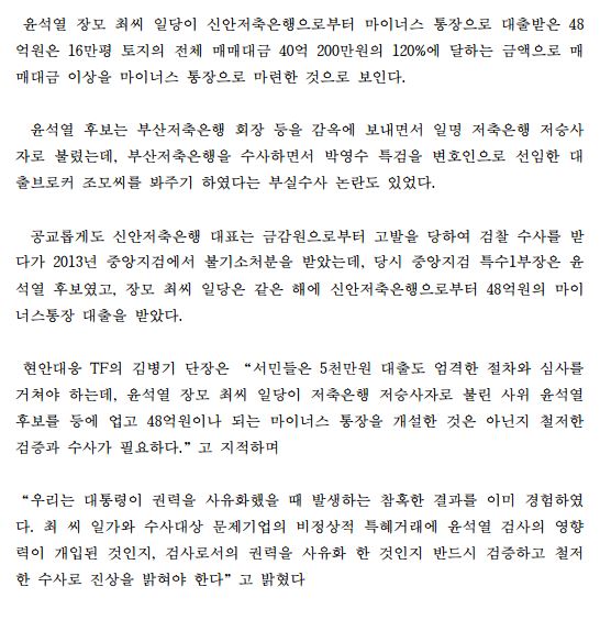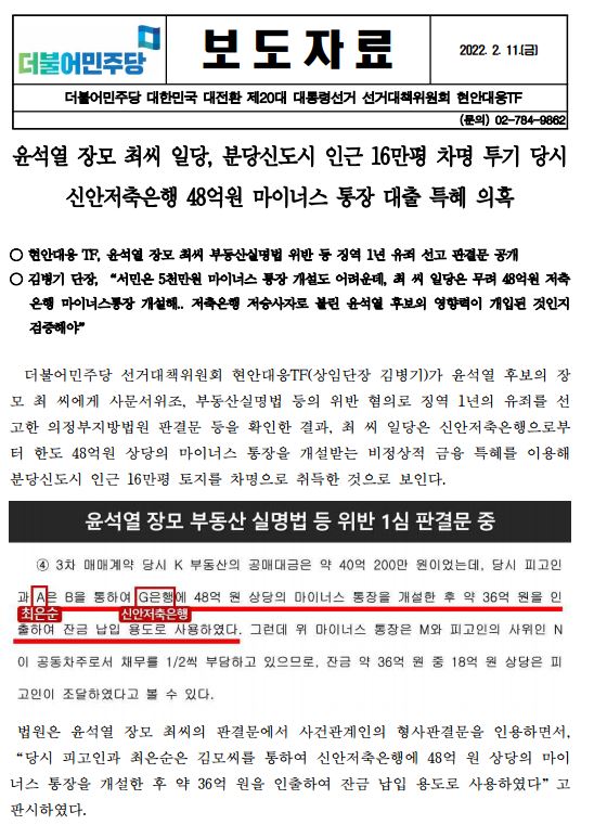 [보도자료] 더불어민주당 선대위 현안대응TF, 윤석열 장모 최씨 일당, 분당신도시 인근 16만평 차명 투기 당시 신안저축은행 48억원 마이너스 통장 대출 특혜 의혹
