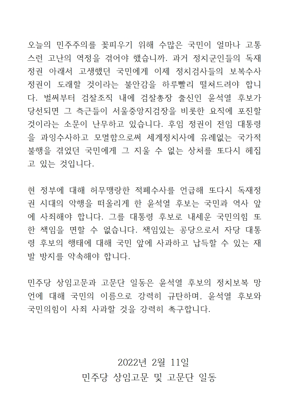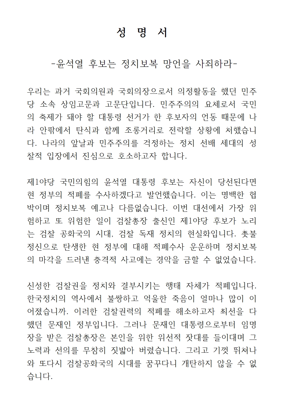 [성명서] 더불어민주당 상임고문 및 고문단, 윤석열 후보는 정치보복 망언을 사죄하라