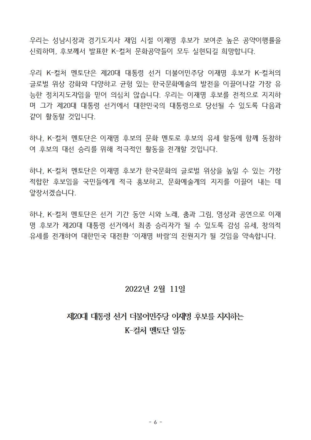 [보도자료] 더불어민주당 선대위 공보단, 문화강국 실현을 위한 'K-컬처 멘토단' 출범 및 지지선언