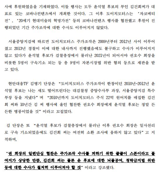 [보도자료] 더불어민주당 선대위 현안대응TF, 주가조작으로 구속기소된 도이치모터스 권오수 회장, 윤석열 부부 교제 시기부터 코바나컨텐츠 '줄줄이 스폰', 뇌물 의혹 밝혀야