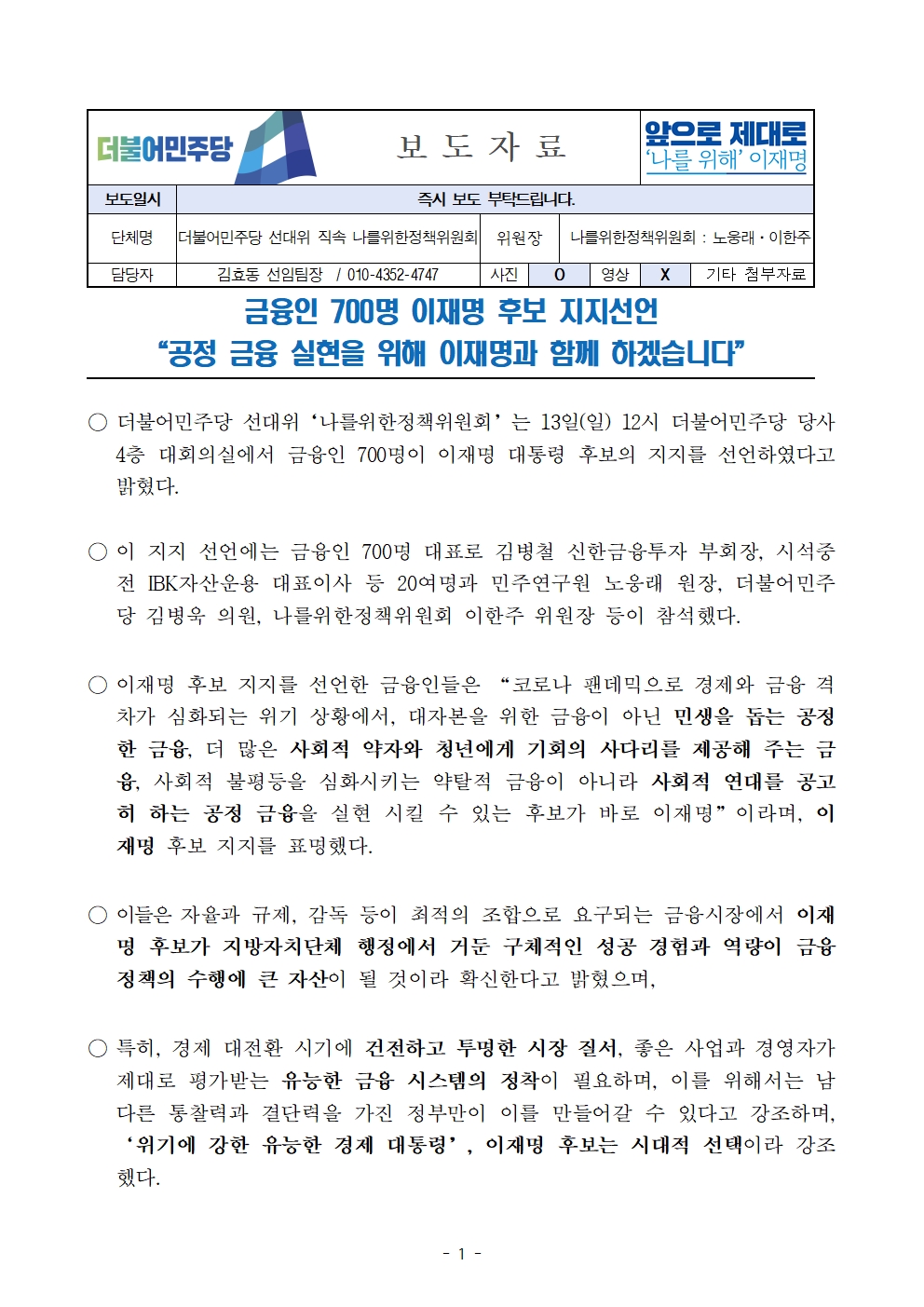[보도자료] 더불어민주당 선대위 나를위한정책위원회, 금융인 700명 후보 지지선언