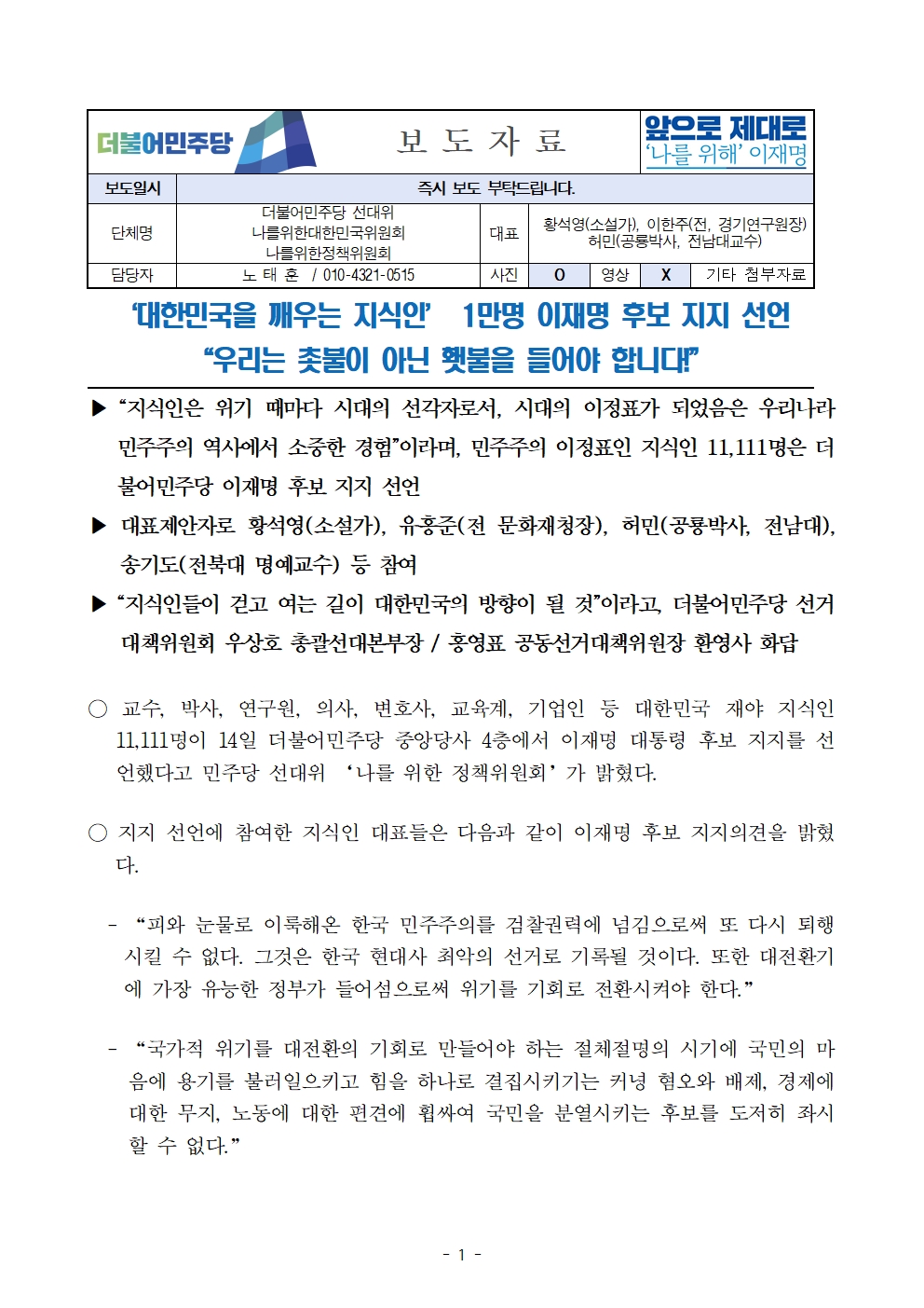 [보도자료] 더불어민주당 선대위 나를위한대한민국위원회·나를위한정책위원회, '대한민국을 깨우는 지식인' 1만 명 후보 지지 선언