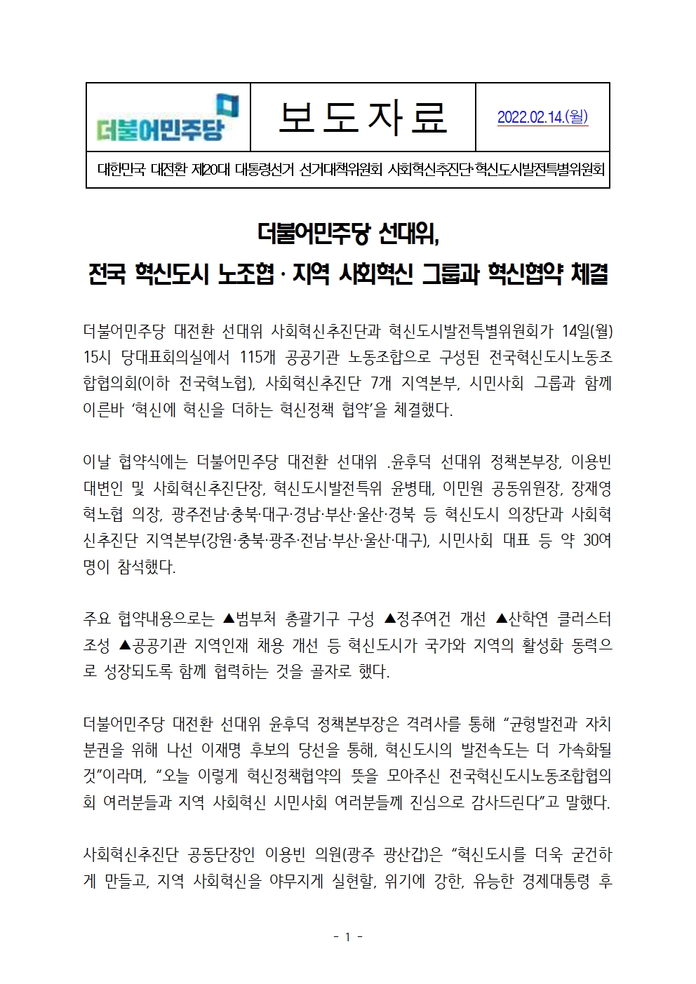 [보도자료] 더불어민주당 선대위 사회혁신추진단·혁신도시발전특별위원회, 전국 혁신도시 노조협·지역 사회혁신 그룹과 혁신협약 체결