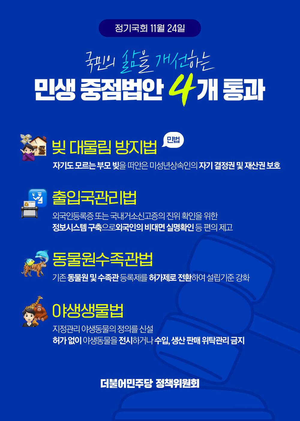 국민의 삶을 개선하는 민생 중점법안 4개 통과