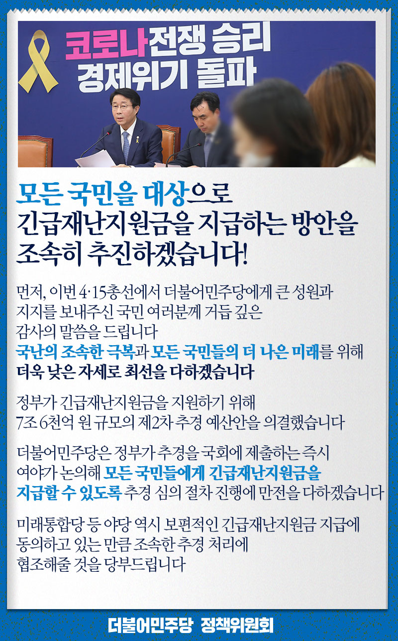 모든 국민 대상으로 긴급재난지원금 지급 방안을 조속히 추진하겠습니다!