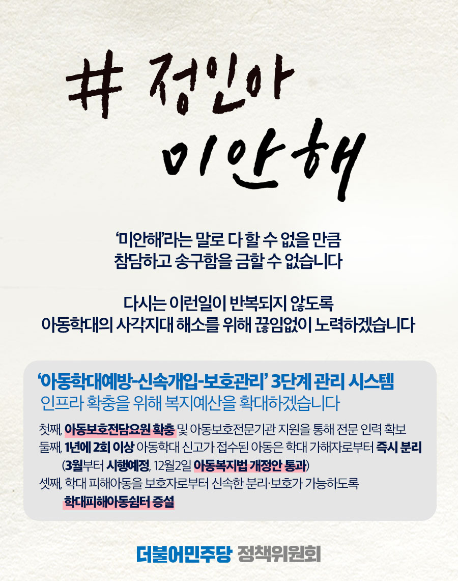 #정인아 미안해, '아동학대예방-신속개입-보호관리' 3단계 관리시스템 복지예산 확대