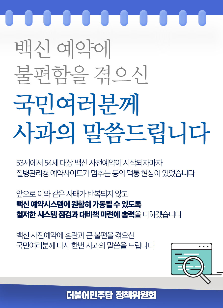 백신 예약에 불편함을 겪으신 국민 여러분께 사과의 말씀드립니다.