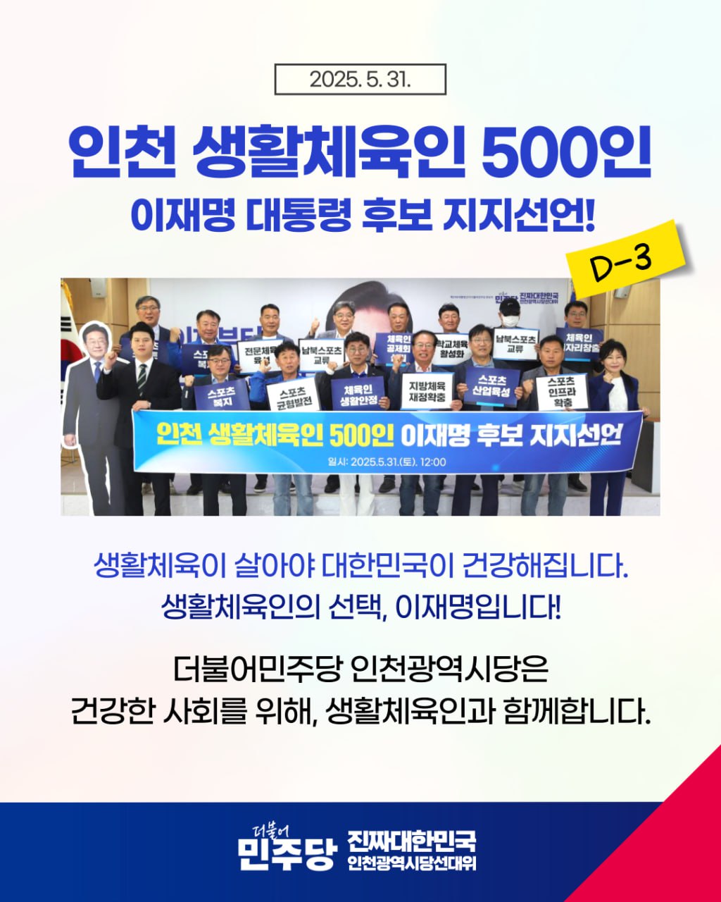 - [카드뉴스] 인천 생활체육인 500인 이재명 후보 지지선언