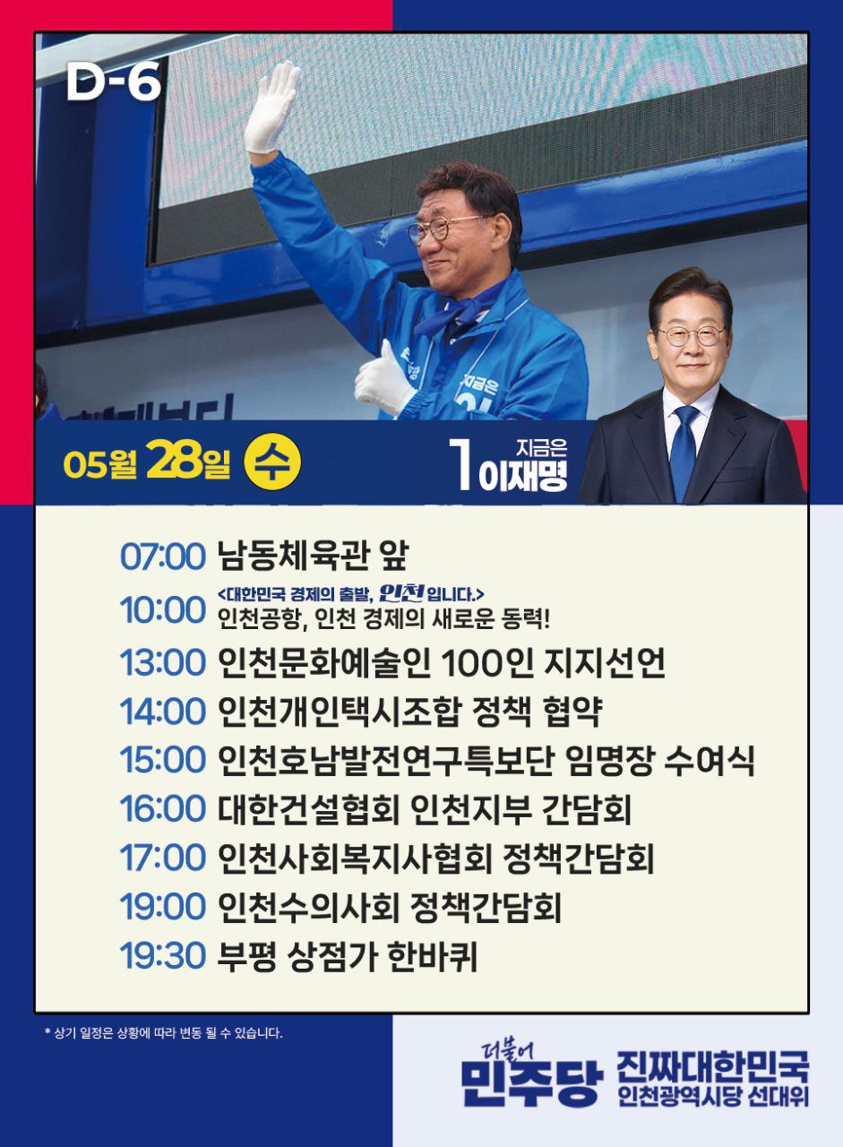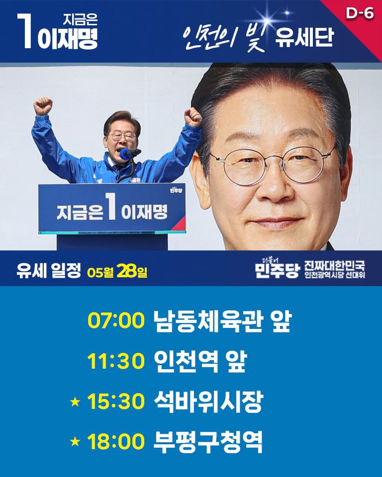 - [카드뉴스] 5월 28일 인천의빛 유세일정