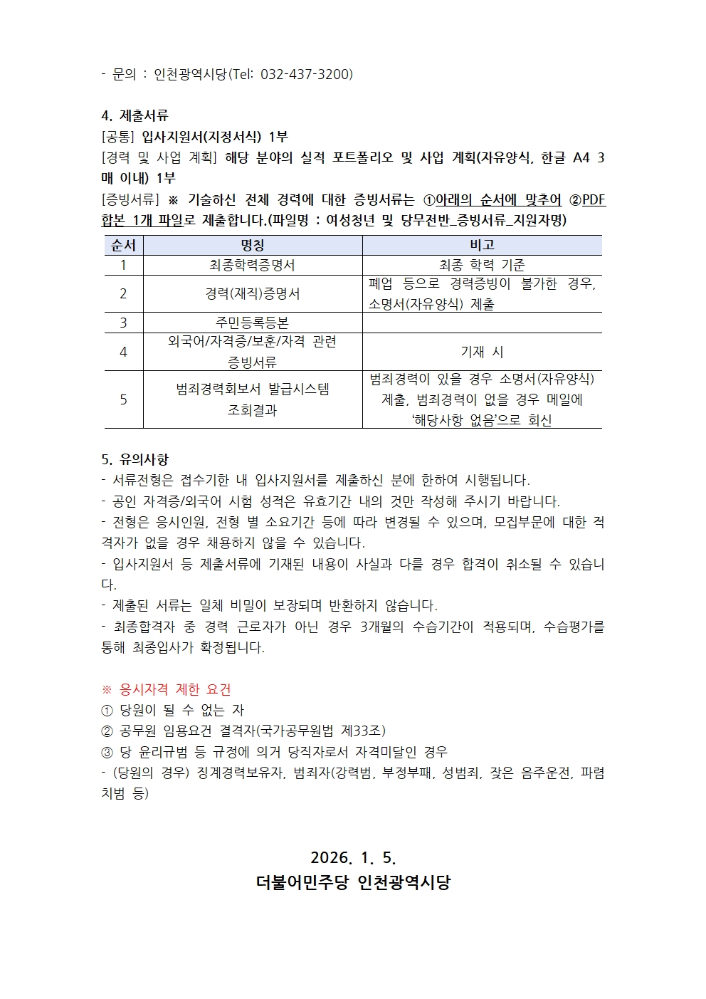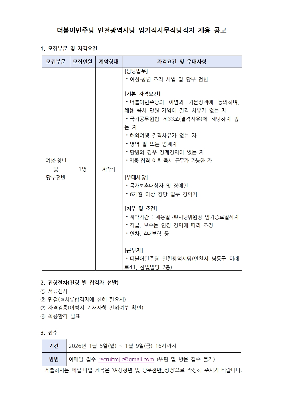 더불어민주당 인천광역시당 임기직사무직당직자 채용 공고