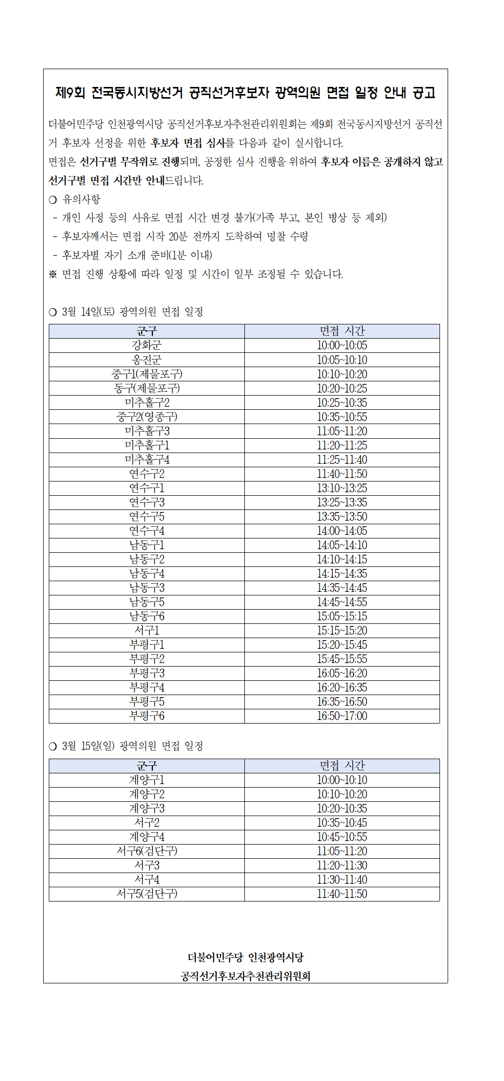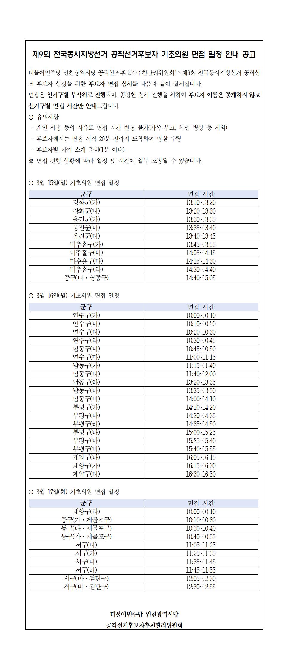 제9회 전국동시지방선거 공직선거후보자 면접 일정 안내