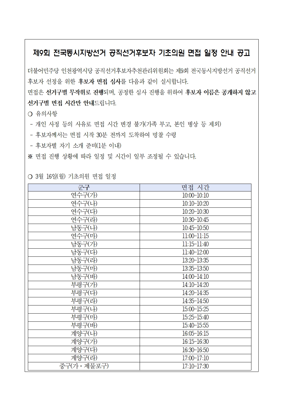 (변경)제9회 전국동시지방선거 공직선거후보자 면접 일정 안내(기초의원)