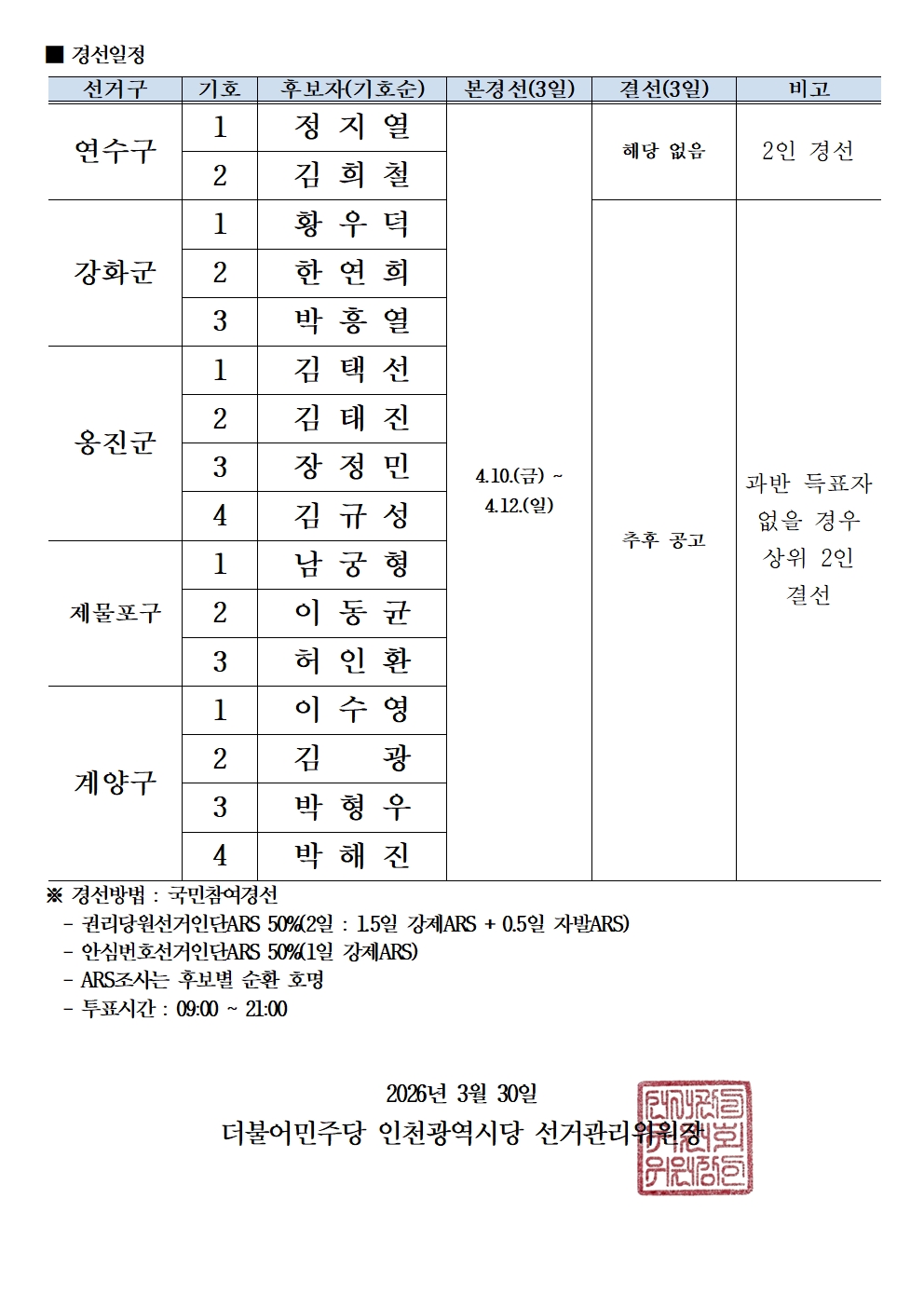 제9회전국동시지방선거_경선후보자 현황_단체장(제물포, 강화, 옹진, 연수, 계양)