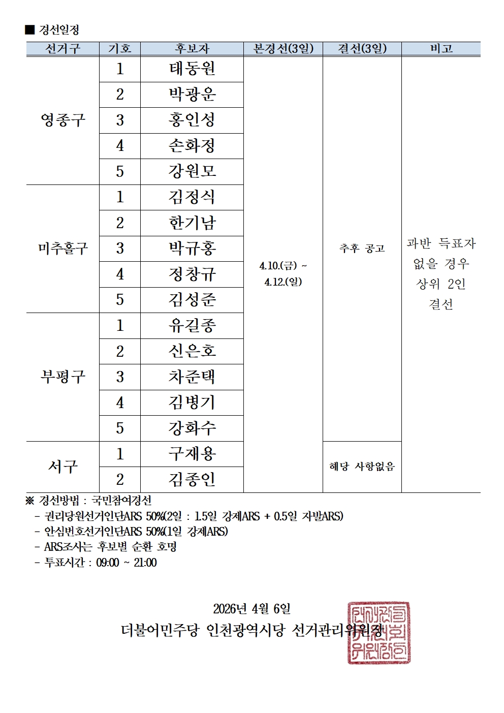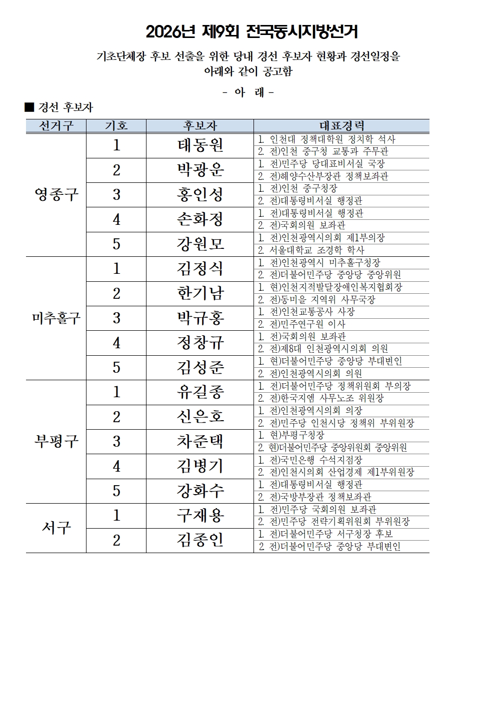 제9회전국동시지방선거_경선후보자 현황_단체장(영종, 미추홀, 부평, 서구)